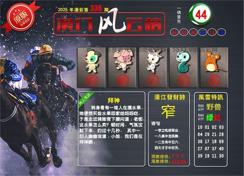 | 335期:六肖中特〖狗鸡鼠虎龙兔〗开:狗44准 |